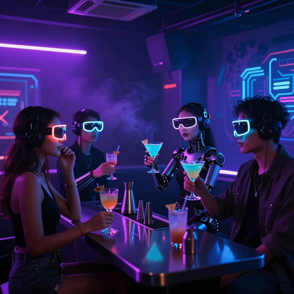 Inside a cyberpunk club pulsing with electric beats, patrons wearing augmented reality visors and LED accessories, smoky atmosphere illuminated by purple and blue neon, robotic bartenders serving glowing cocktails, immersive futuristic vibe with tech graffiti