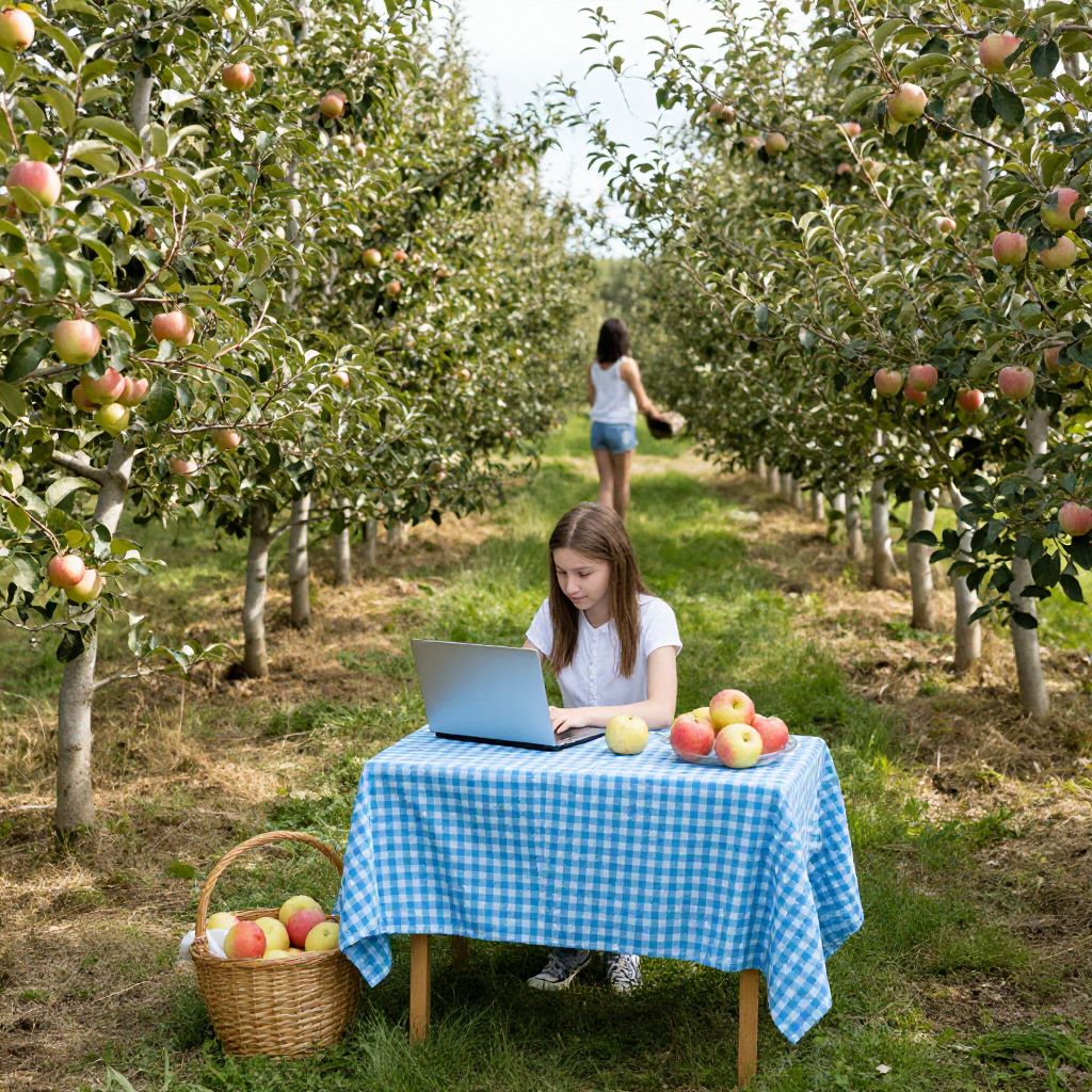 The girl is working in the garden!. Work in garden, blue tablecloth, apple orchard, table, red, yellow apples, outdoor, summer, girl, woman, laptop, quite place