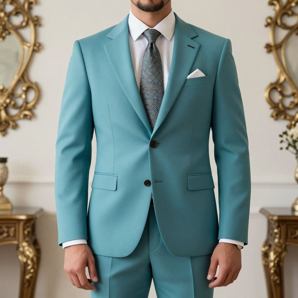 A well-dressed man stands confidently, showcasing refined style in a tailored turquoise suit paired with a stylish tie. The elegant background features ornate decor, enhancing the sophisticated atmosphere of the scene.