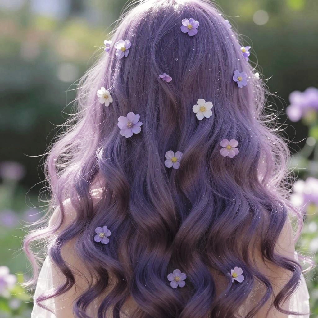 Close-up of long dark curly hair entwined with delicate flowers, soft focus, dreamy atmosphere, vibrant colors, nature-inspired portrait, artistic composition