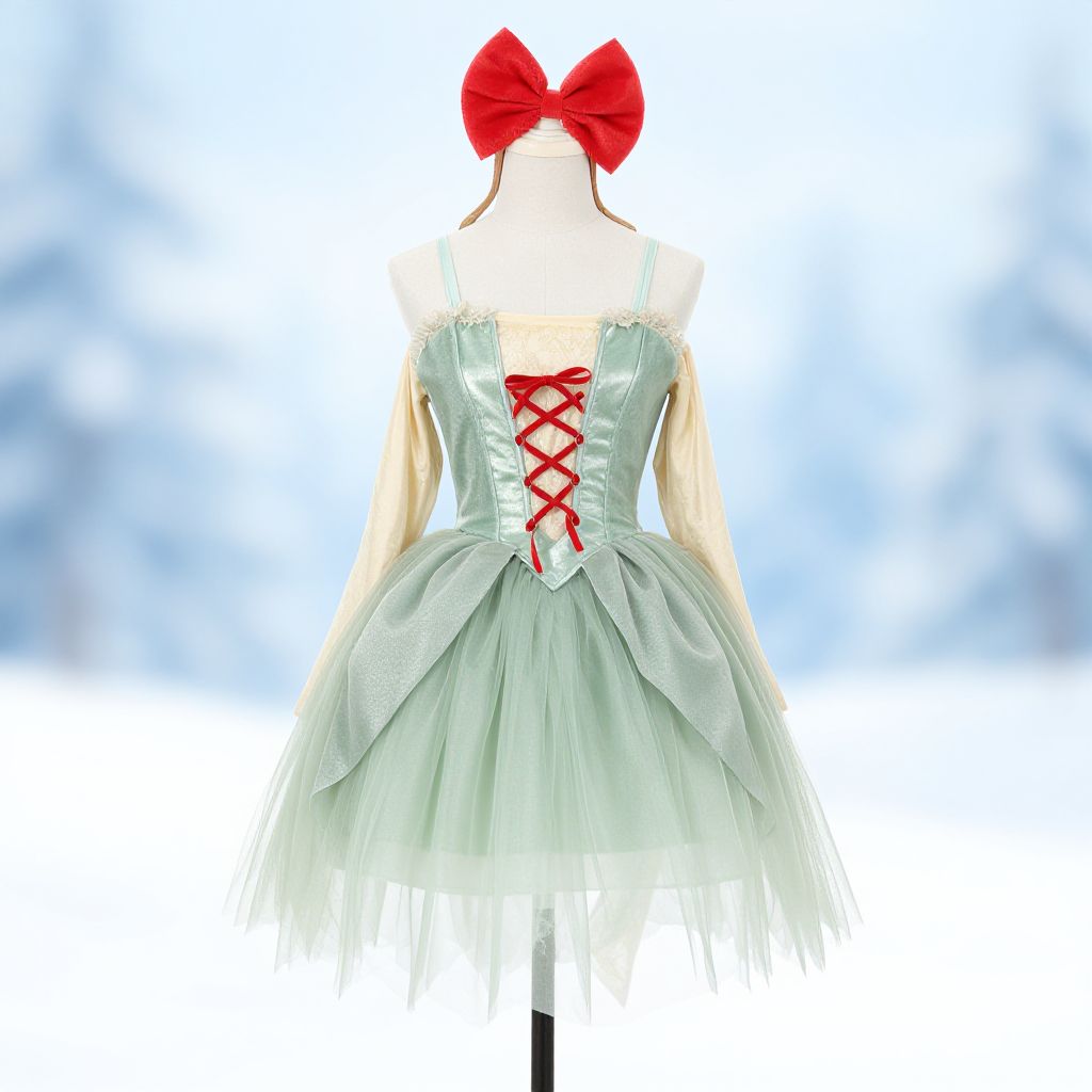 Photograph of a mannequin dressed in a pastel green, strapless, ballgown-style dress with a corset-like bodice, featuring a red lace-up front. The dress has a voluminous, tulle skirt with sheer, cream-colored, long sleeves. The mannequin's head is adorned with a large, bright red bow. The background is a soft, blurred blue, creating a dreamy, ethereal effect. The image emphasizes the dress's delicate, fairy-tale-like design and the contrast between the green fabric and the red accents.