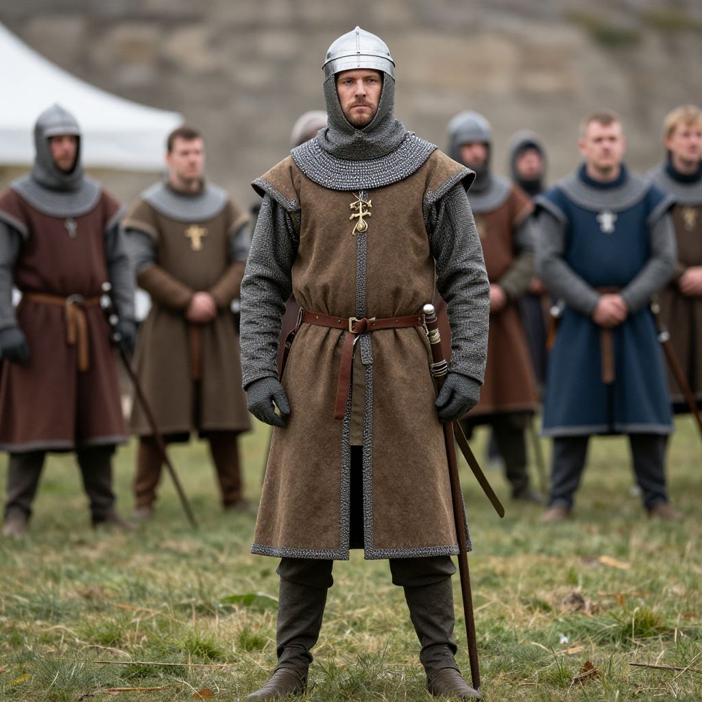 Photograph of medieval knight in brown tunic, chainmail, and silver helmet, standing center with sword, surrounded by five armored soldiers.