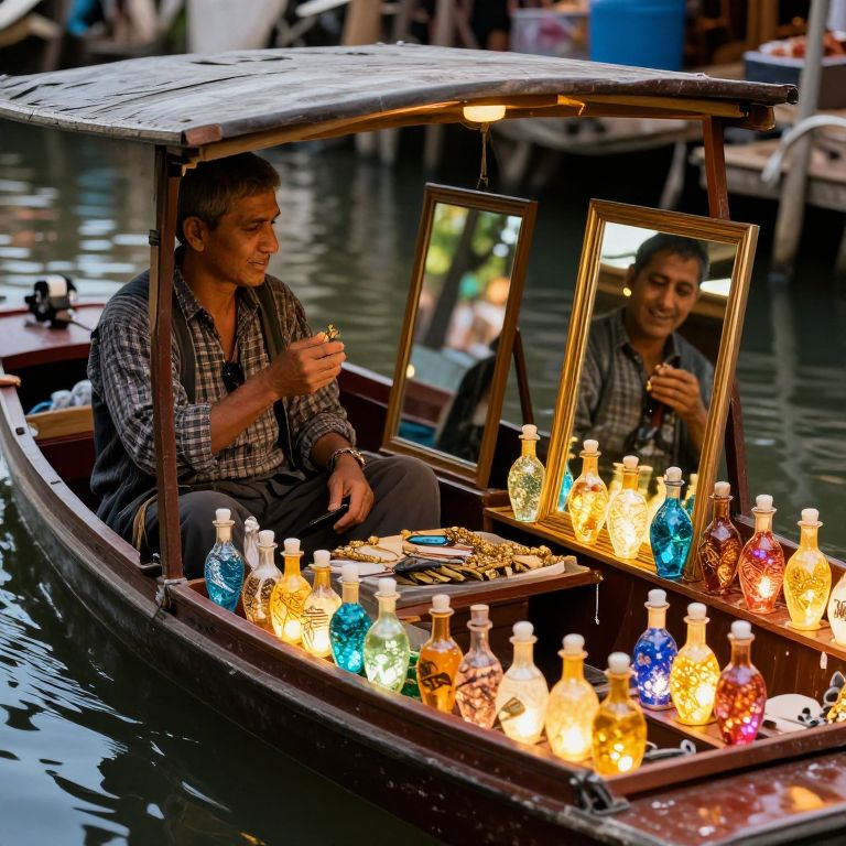 Photograph of a smiling Asian man with short black hair, wearing a checked shirt, sitting in a wooden boat on a calm waterway, illuminated by glowing, colorful glass bottles in various shapes and sizes. Two large, tilted mirrors reflect his image and the vibrant bottles. The boat's thatched roof casts shadows, enhancing the warm, glowing ambiance. The background is slightly blurred, showing other boats and people, suggesting a bustling market scene. The man's focused and joyful expression, combined with the colorful lights, create a lively and inviting atmosphere.