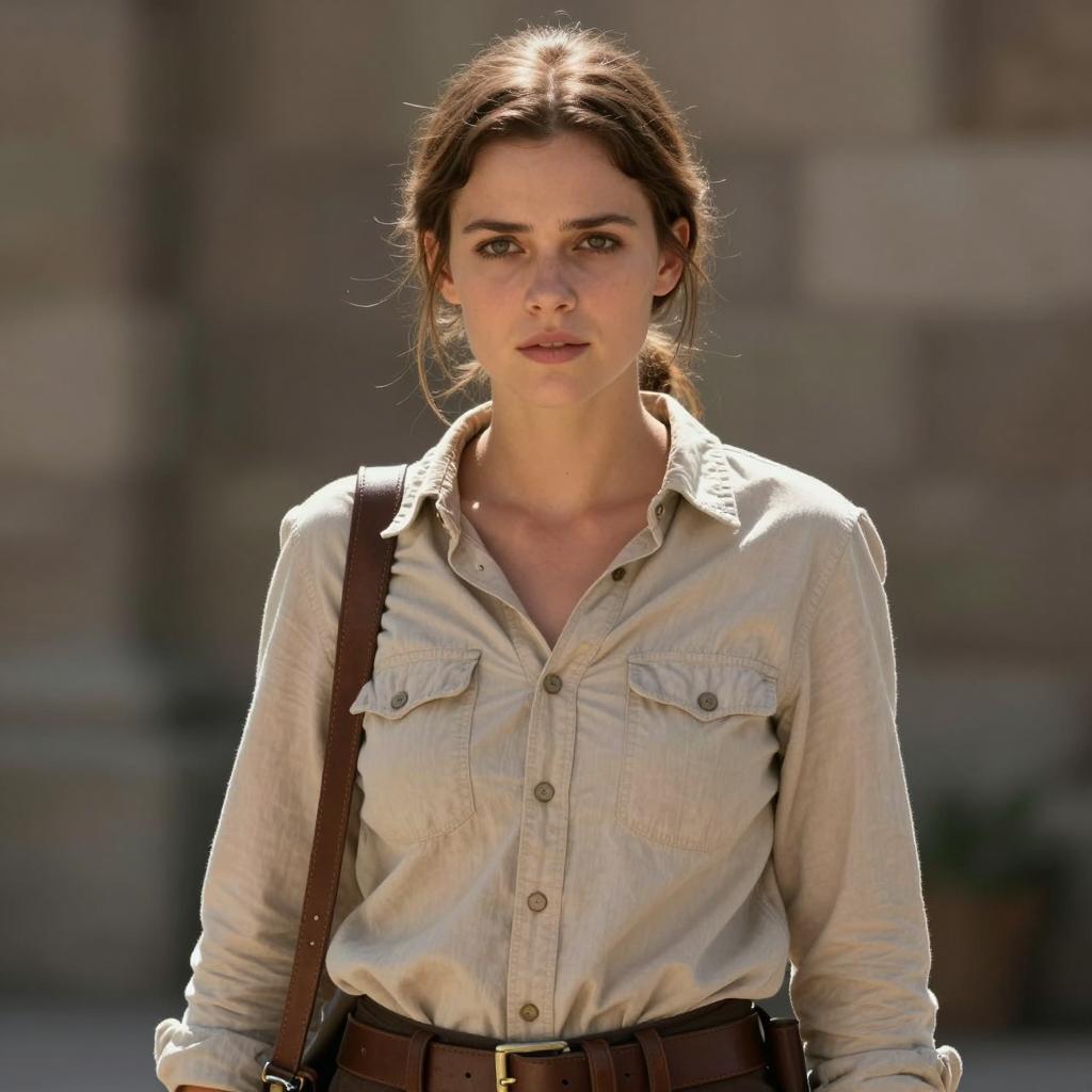 Photorealistic close-up of a young Caucasian woman with blue eyes and medium-length brown hair styled in a braid, wearing a tan safari hat, brown button-up shirt, and suspenders. She has a serious expression and slightly tanned skin, captured outdoors in natural daylight with a blurred background.