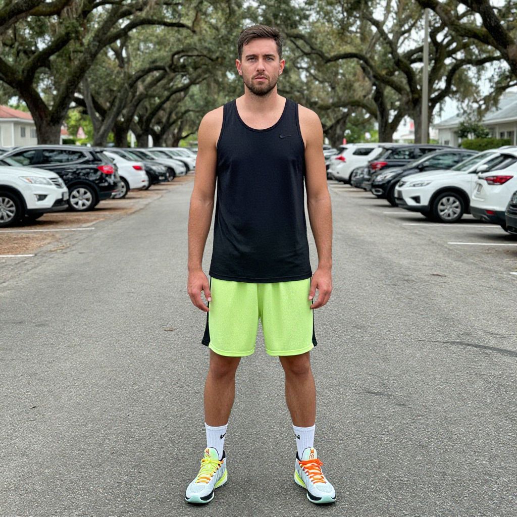 A man, lightweight moisture-wicking tank top, black and neon green, breathable mesh shorts, high-performance basketball sneakers, expansive asphalt lot, rows of parked cars, shaded by tall oak trees, oversaturated film style, confident expression. Man has masculine face and piercing eyes