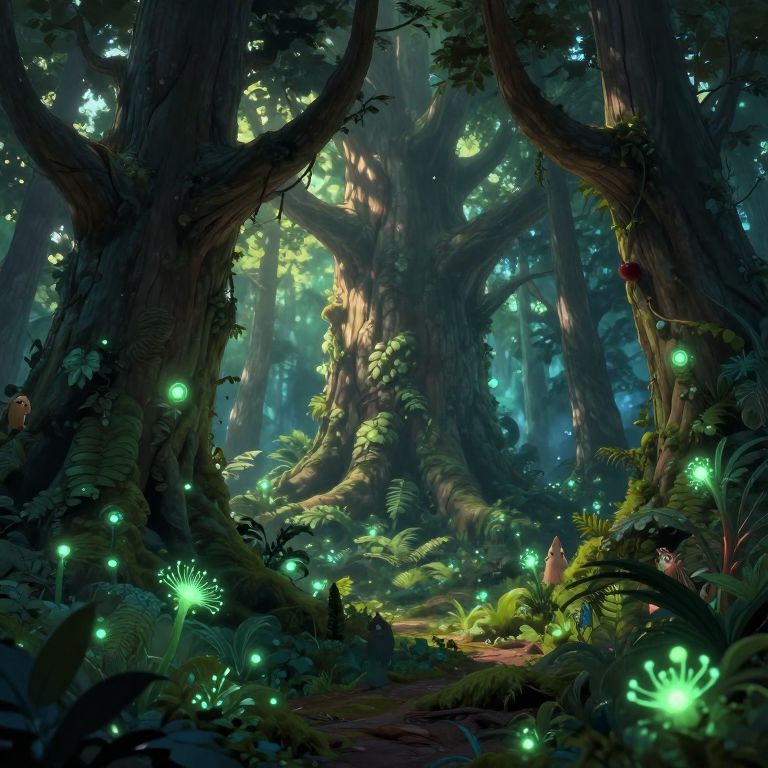Picktures of an enchanted forest with giant ancient trees, glowing bioluminescent plants, whimsical creatures peeking through dense foliage, soft rays of sunlight filtering down, fantasy art with a magical and mysterious mood.