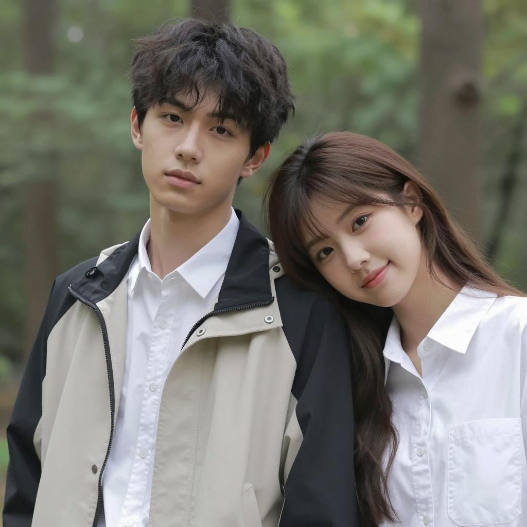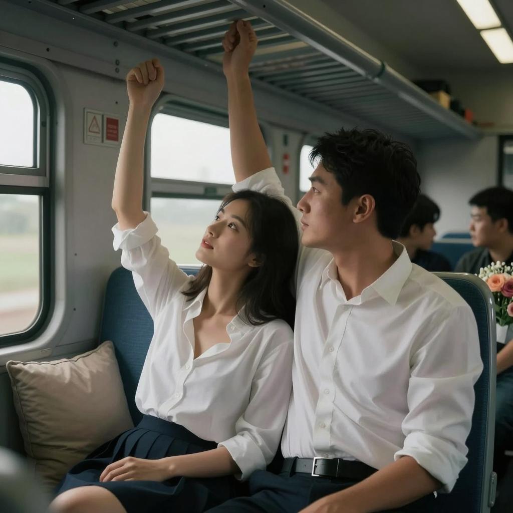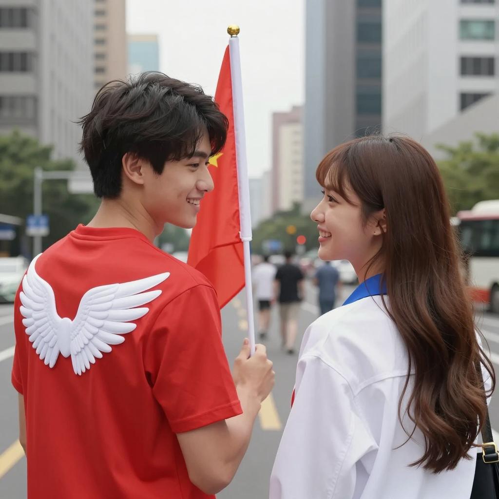 Young man with short dark hair, smiling, wearing red shirt with white wing , holding red flag. Young woman with long brown hair, smiling, wearing white jacket, blue shirt. Urban background with tall buildings, people in the distance. Man on left, woman on right, both facing each other. Red flag behind them.