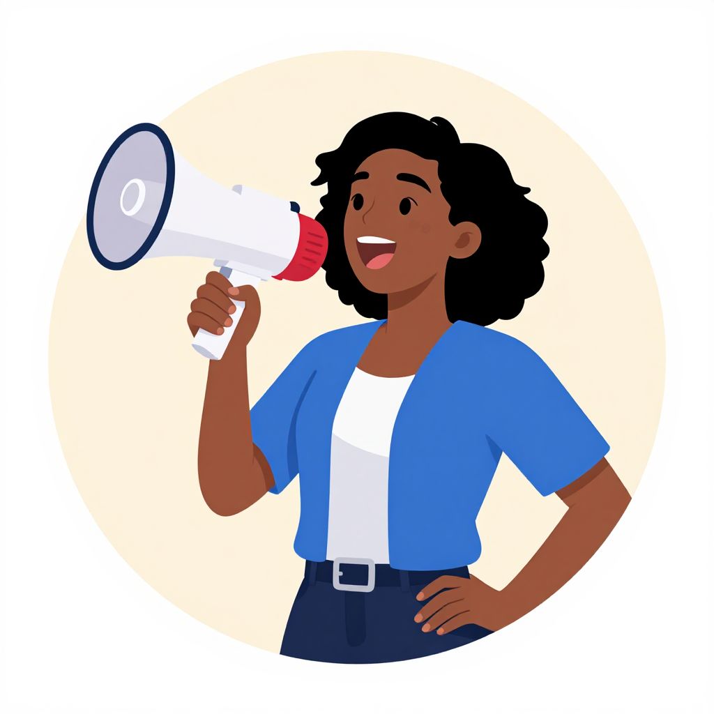 Digital illustration of a smiling Black woman with dark brown skin and curly black hair, wearing a white sleeveless top and navy blue skirt. She is holding a white and red megaphone to her mouth with her right hand, while her left hand rests on her hip. She has gold hoop earrings and is set against a light blue circular background. The style is vibrant and cartoon-like, with bold, flat colors and simple, clean lines.
