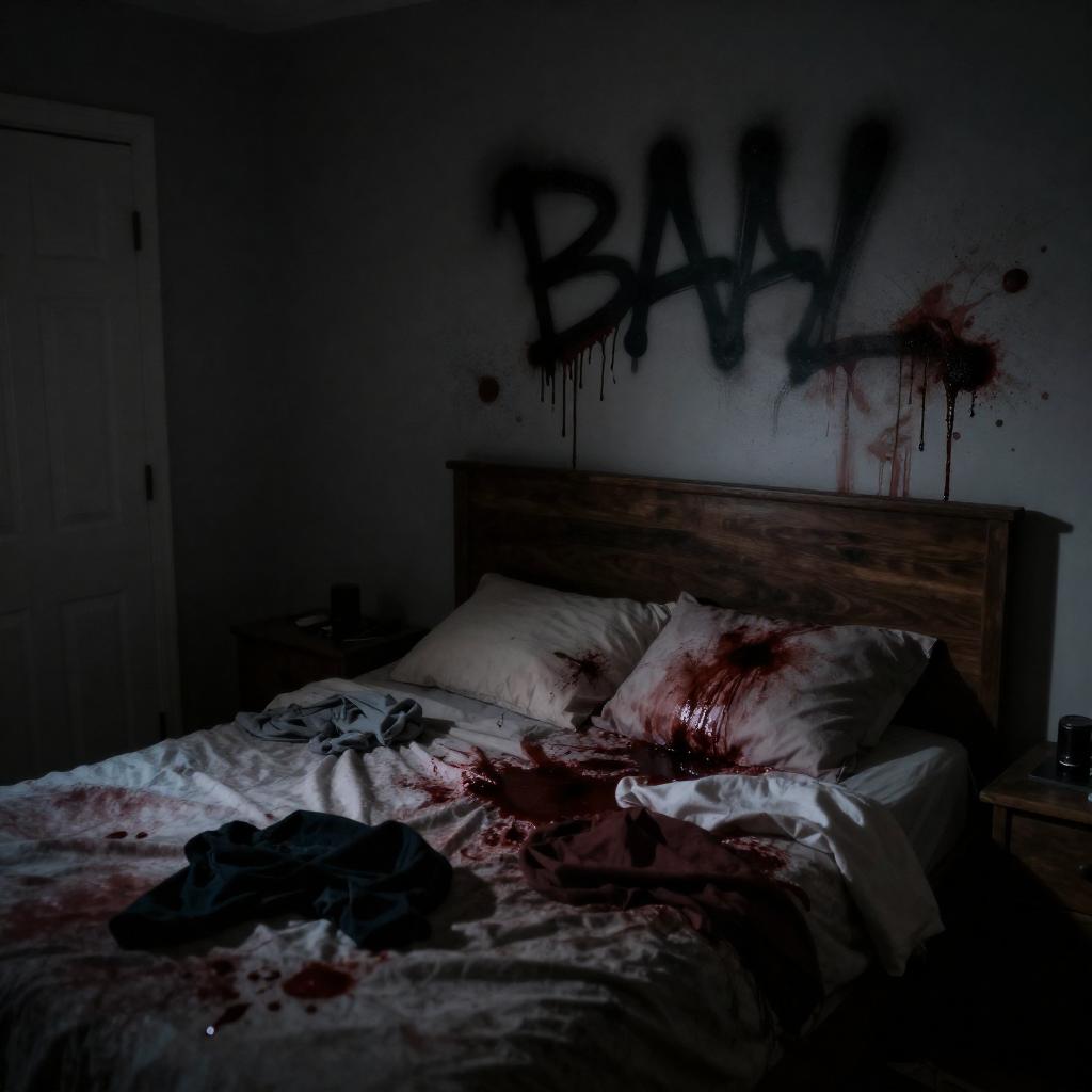 Photograph of a darkened bedroom. Bloody graffiti on wall. Unmade bed with bloodstained pillows and clothes. Wooden headboard. Person in foreground, partially visible, shadowed. Door in background. Dim lighting. Intense, unsettling atmosphere.