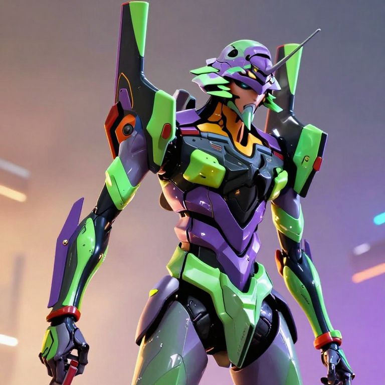 This digital CGI image depicts a futuristic, humanoid mecha robot standing in a dynamic, low-angle shot. The robot has a sleek, angular design with vivid colors, including neon green, black, purple, and orange accents. Its head features sharp, wing-like appendages, and it has a focused, almost aggressive expression. The mecha's chest and shoulders are prominently armored, with glowing neon green panels. The background is blurred with multicolored lights, suggesting a high-tech, possibly urban environment. The image has a glossy, high-contrast style, highlighting the robot's metallic surfaces and giving it a powerful, futuristic appearance.