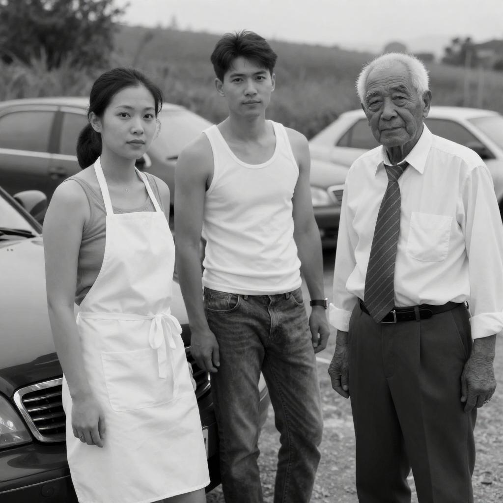 Photograph of three people on a beach. Older man with gray hair, glasses, and blue striped shirt pointing at the camera. Young woman with black hair in a braid, wearing yellow and red plaid dress, serious expression. Young woman with long black hair, purple top, back to camera. Overcast sky, flat beach background.