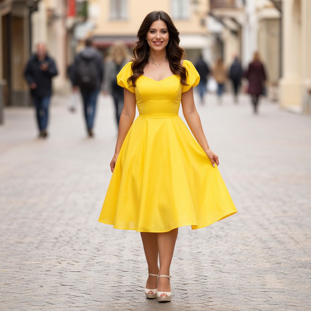 Photograph of a young woman with long, wavy dark brown hair, wearing a bright yellow, short-sleeved, knee-length dress with a flared skirt. She stands on a cobblestone street, smiling, with her arms relaxed by her sides. She wears beige, open-toe, high-heeled shoes. The background features blurred pedestrians and buildings, suggesting an urban European setting. The overall composition highlights her vibrant dress against the muted, textured street and buildings. The lighting is natural, enhancing the color contrast between her dress and the background.