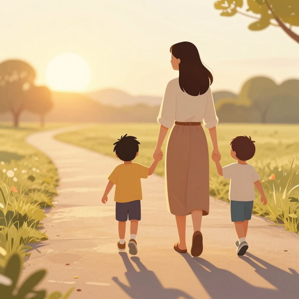 A warm, digital illustration depicts a woman with long black hair, wearing a white blouse and brown skirt, holding hands with two young boys, one in a yellow shirt and blue shorts, the other in a white shirt and blue shorts. They walk away from the viewer on a sunlit, grassy path, with soft, golden sunlight casting long shadows. The background shows a serene, expansive park with blurred trees and a glowing sunset. The scene exudes a peaceful, familial atmosphere.