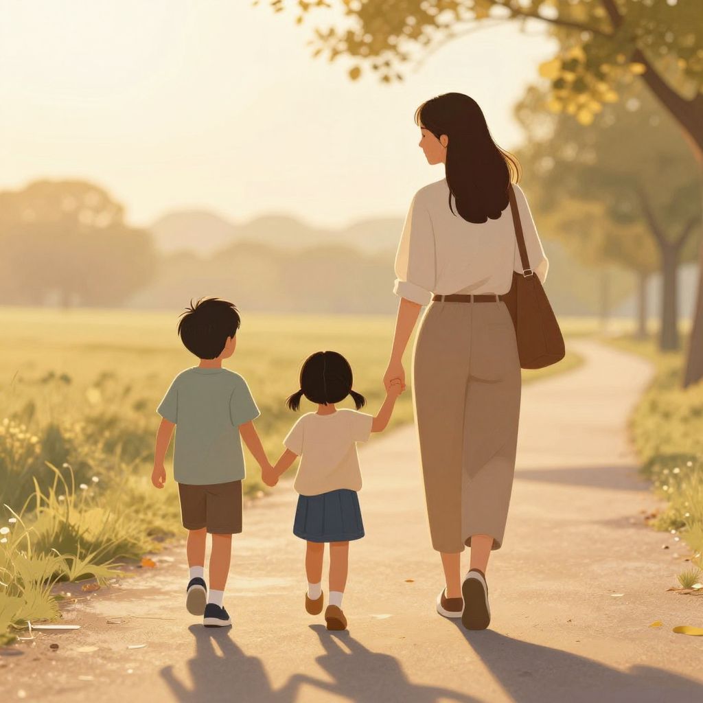 A serene digital illustration captures a woman and two children walking hand in hand along a sunlit path during golden hour, their figures bathed in warm, diffused light, evoking a sense of familial connection and shared energy.