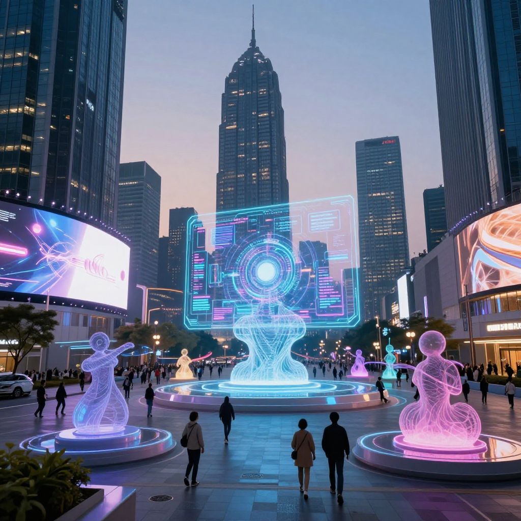AI art images portraying a futuristic cityscape at dusk, illuminated by holograms and digital billboards, with AI-generated sculptures and installations integrated into public spaces, blending urban life with cutting-edge artificial creativity and innovation