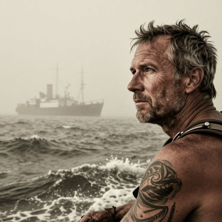A seasoned shipwreck explorer, his sun-etched skin and piercing blue eyes emerging from a foggy, sepia seascape, blends seamlessly with the roiling waves. The texture of salt spray mingles with the lines on his face as he gazes out to sea, lost in introspection. A distant ship appears through the haze, casting a faint glow upon his weathered features and intricate arm tattoo. This interplay of images evokes an atmosphere of longing and untold stories, inviting viewers to reflect on the resolute adventurers who dare venture beyond familiar shores.