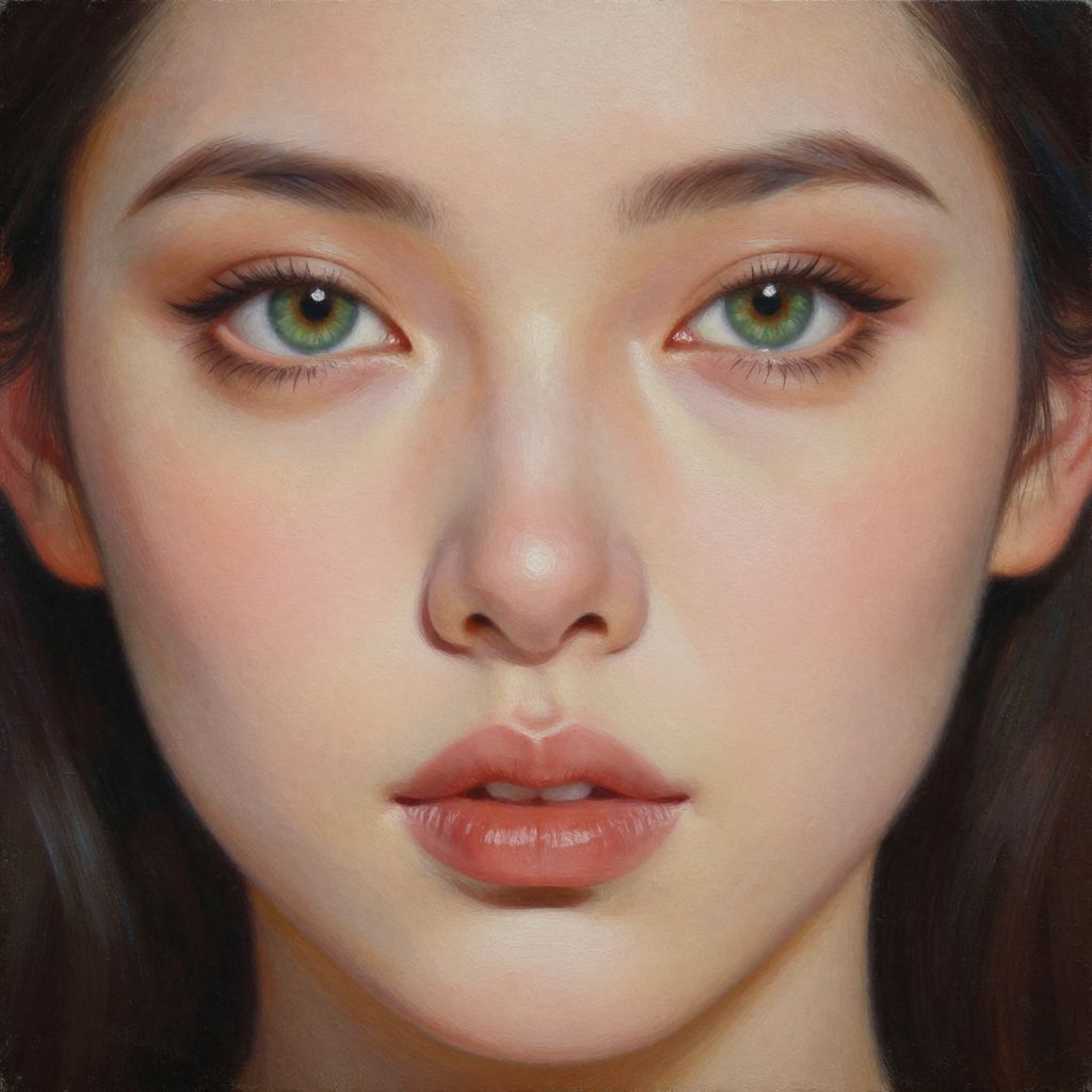 Hyper-realistic oil painting captures a close-up portrait of a woman's face, featuring striking green eyes, meticulously detailed makeup, and soft lighting that accentuates her delicate facial features and expressive gaze.