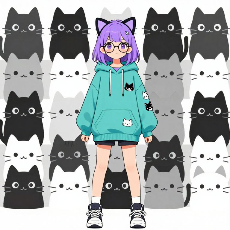 A charming anime-style illustration of a girl with pastel purple hair and glasses, standing confidently in the center of a background filled with cute, minimalistic cats in black, white, and gray, She wears a teal hoodie with playful cat-themed patches and a pair of casual sneakers, exuding a quirky yet adorable vibe, Her cat-ear accessory matches her playful personality, The background features rows of stylized cats with expressive eyes, creating a harmonious and whimsical atmosphere, The overall color scheme uses soft pastels and neutral tones to emphasize the cozy and cute setting