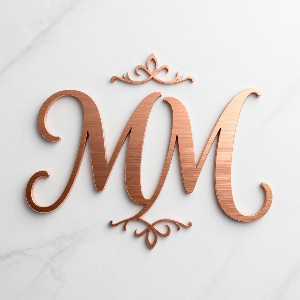 Luxury elegant MM logo crafted from brushed copper and rose gold blend, featuring cursive calligraphic letters with ornamental flourishes, layered on a marble white backdrop, perfect for premium boutique business visuals.