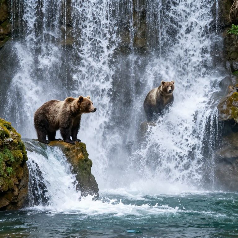 Serenity whispers through the misty forest as two bears perch above a cascading waterfall, their presence a quiet testament to the timeless connection between nature and the soul, where every drop of water carries the echoes of ancient dreams and the promise of renewal.