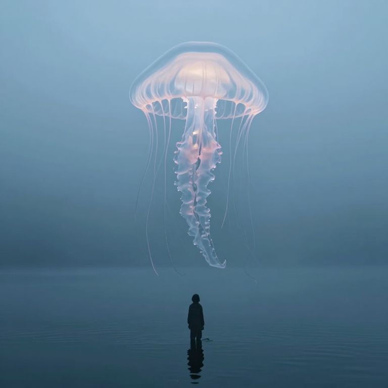 In a mist-shrouded realm where time seems suspended, a colossal, translucent jellyfish hovers above a solitary figure, its pulsating tendrils weaving a tapestry of forgotten dreams and unspoken secrets, while the stillness of the water mirrors the quiet introspection of existence.