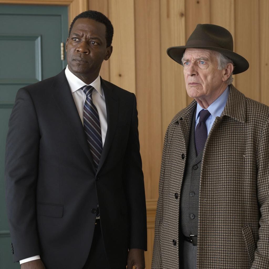 Black man with dark skin, wearing a brown hat and blue jacket, aiming a silver revolver. Wooden background. Serious expression. Hands gripping the gun. Right side of image partially shows another person's leg in gray pants. Mid-shot.