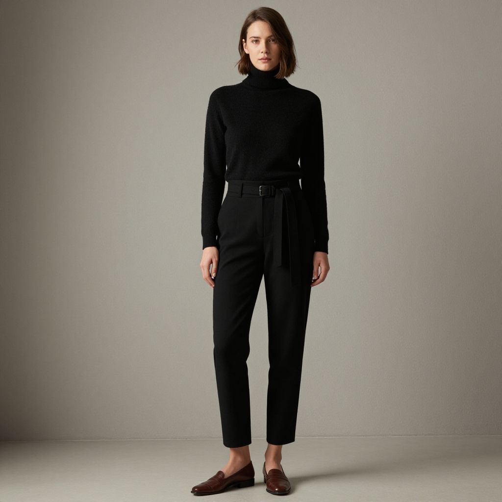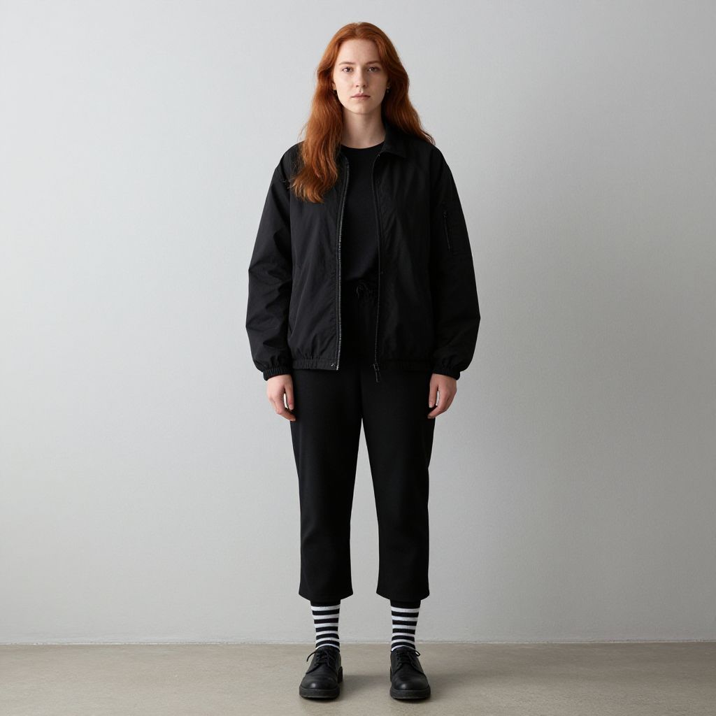 Woman with long red hair wearing a black jacket and black pants with striped socks and black shoes.