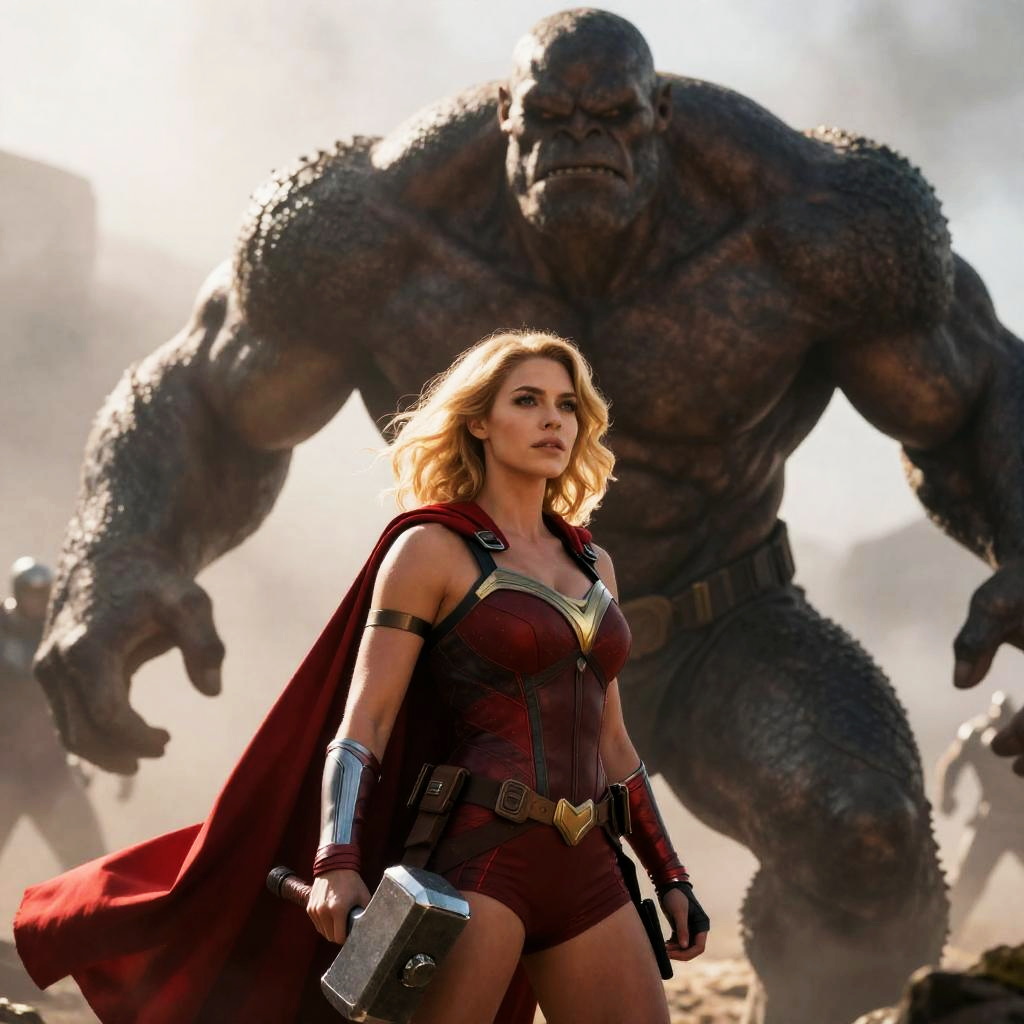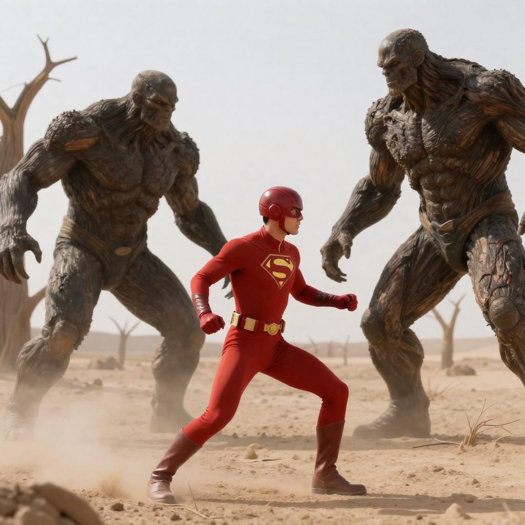 Superhero in Red Suit Facing Tree Monsters in Desert