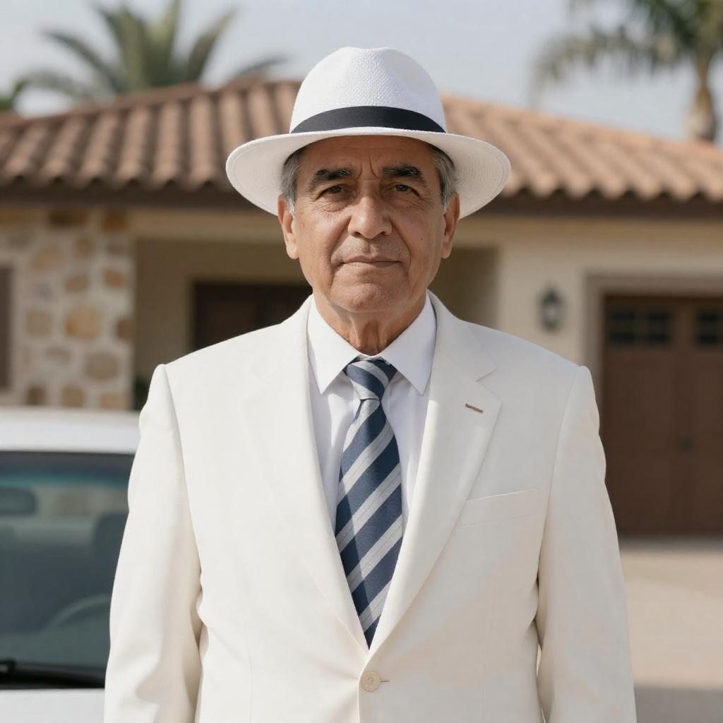 Middle-aged man in white suit, striped tie, and white hat stands in front of a house with stone walls and a car. Background includes palm trees and a tiled roof. Man has a calm expression. Photo.