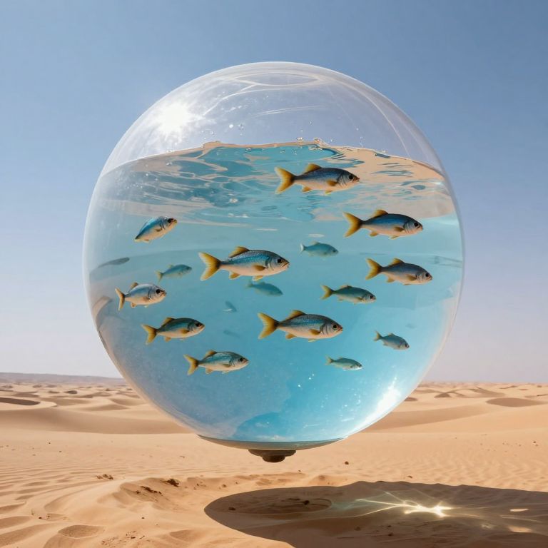 Suspended above a vast desert expanse, a transparent spherical dome cradles a school of fifteen fish gracefully swimming in midair, defying gravity within its crystalline confines as sunlight casts a shimmering reflection on the arid landscape below.
