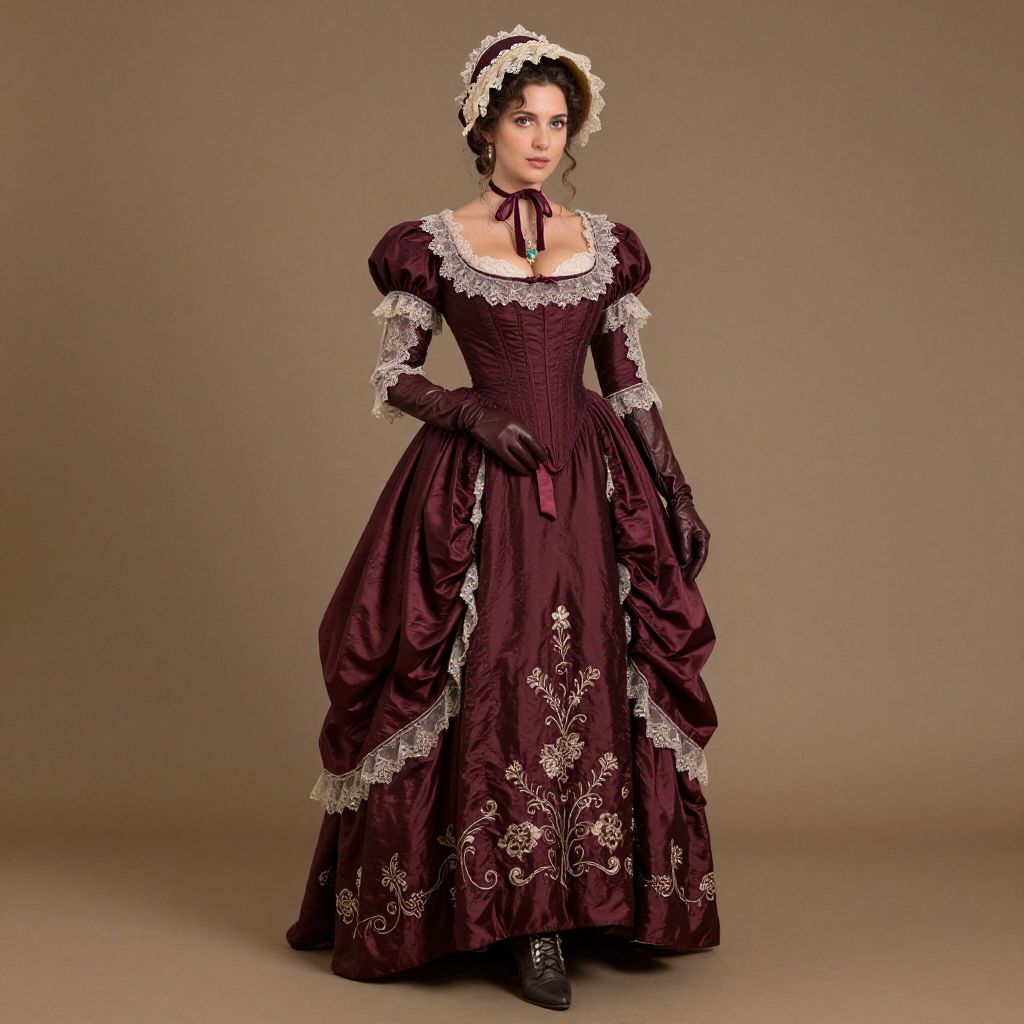 Full body shot, lanky woman, elegant 1860s Civil War era gown, rich burgundy silk fabric, fitted bodice, high neckline, long puffed sleeves, delicate lace trim, flowing floor-length skirt, intricate floral embroidery, layered petticoats, cinched waist with satin ribbon, matching bonnet with lace, vintage leather gloves, ankle-length lace-up boots, subtle vintage jewelry, soft natural makeup, period-appropriate hairstyle with loose curls, historical authenticity, graceful posture Sexy. Pretty face and beаutiful eyes. Big breasts