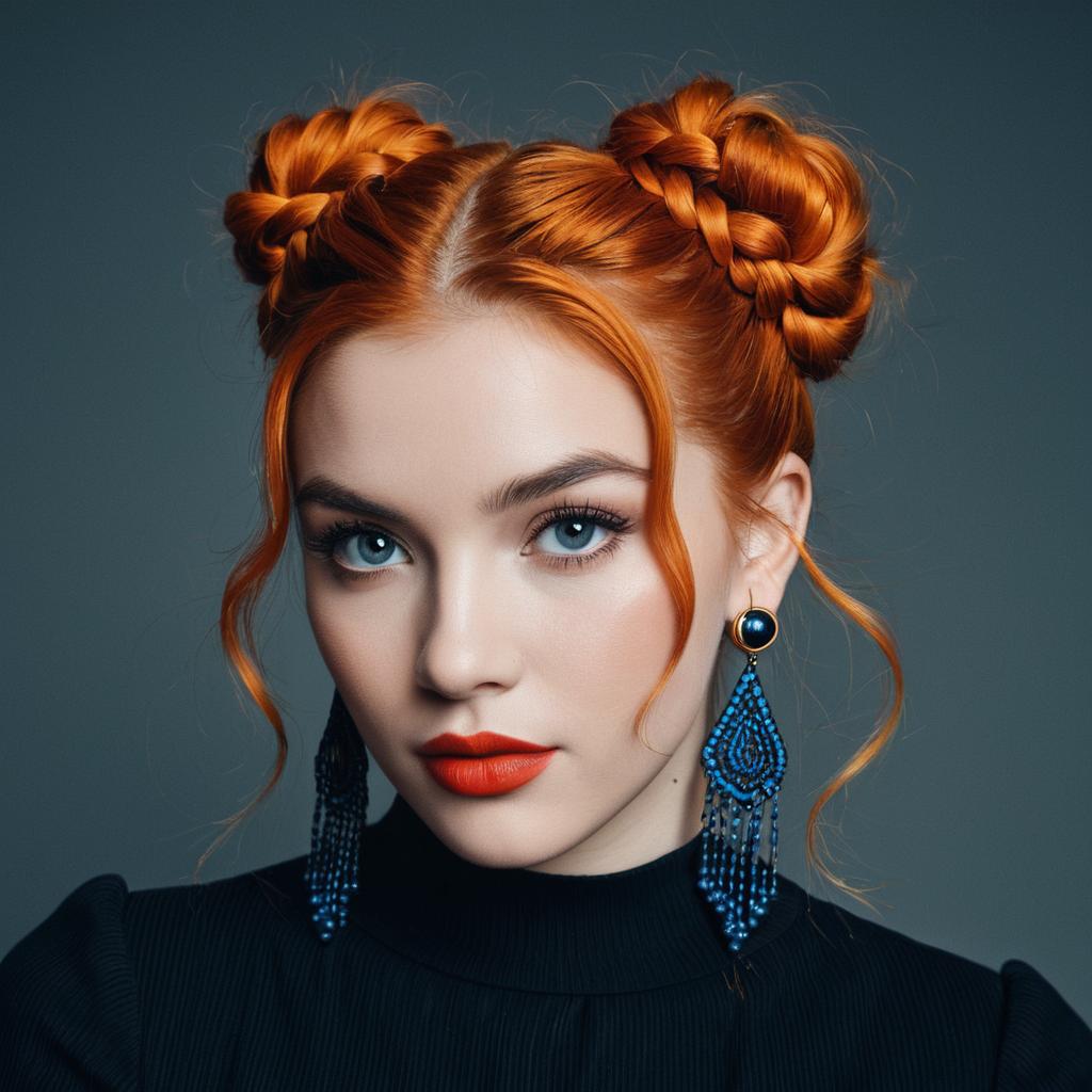 Portrait of a young woman with vibrant orange hair styled in an intricate braided updo with buns, wearing bold blue eye makeup and subtle lip color, elegant earrings visible, wearing a black top, set against a soft grey studio background