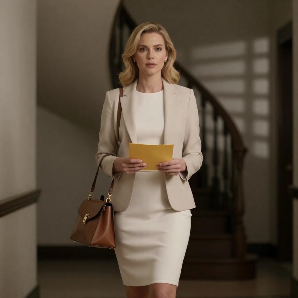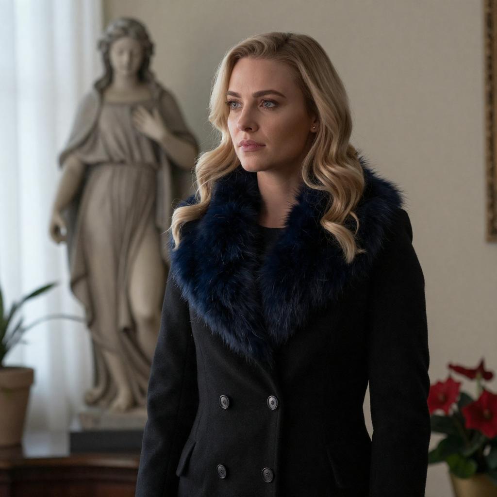 Photograph of a blonde woman with fair skin, wearing a black military-style coat with gold buttons and a white turtleneck, standing in a green-tiled stairwell with a wooden handrail. She looks slightly to the right with a serious expression. The background includes green-tiled walls and a staircase.