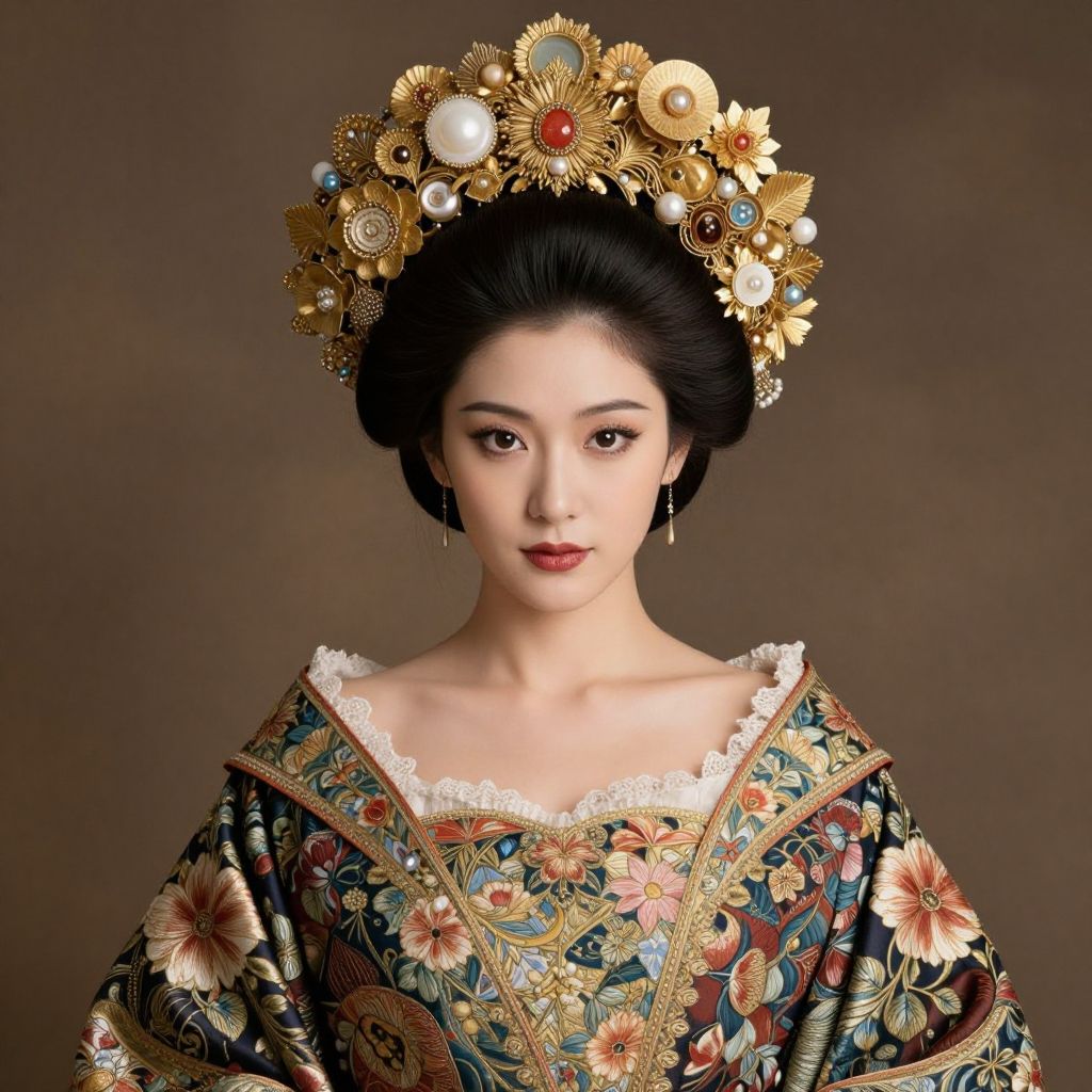 Photograph of an Asian woman in traditional, ornate floral-patterned kimono with gold embroidery, wearing an elaborate, gold floral headpiece against a