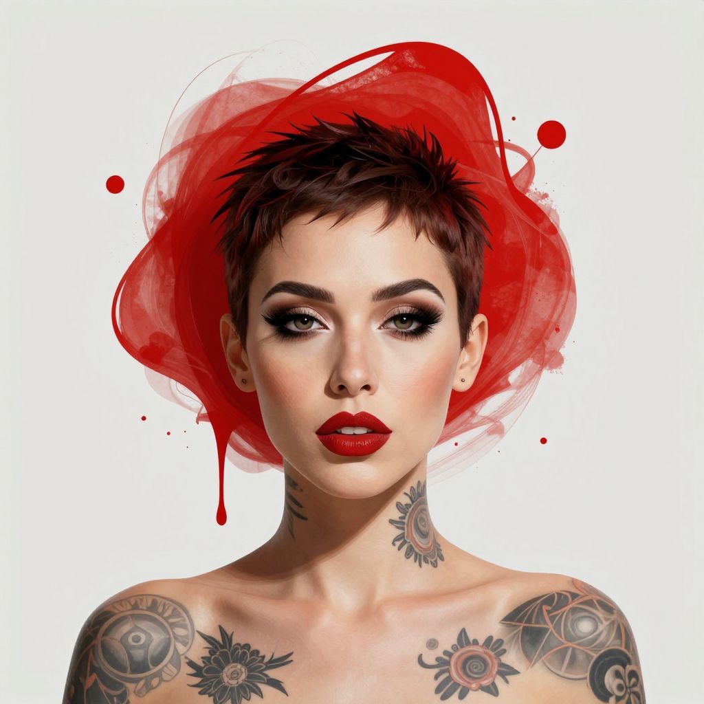 A stylized digital artwork featuring a woman with short hair, tattoos, and a red, abstract design behind her head.