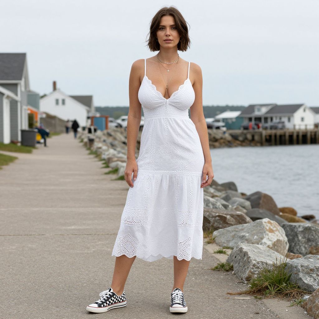A hourglass woman in a casual contemporary white midi dress with eyelet detailing and black and white checkered low-top sneakers, layered necklaces, and minimal makeup, captured in a camera obscura style at a fishing village seaside promenade. Sexy. Pretty face and beаutiful eyes. Big breasts