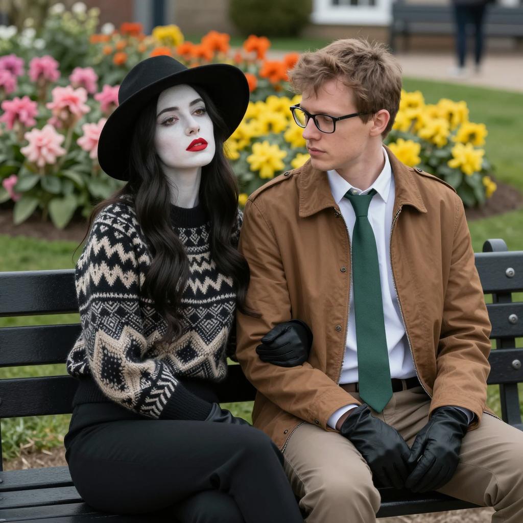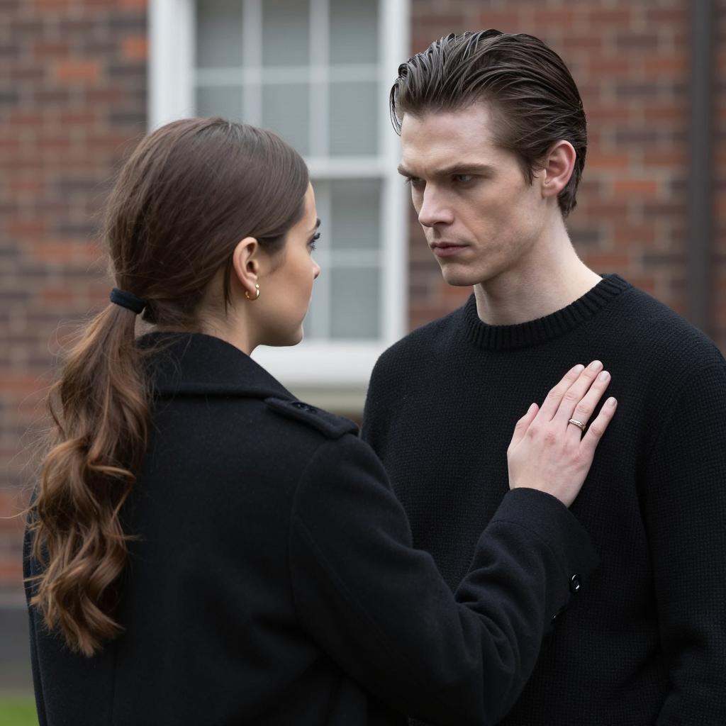 Photograph of two people. Man with pale skin, dark slicked-back hair, black sweater, intense expression, facing woman. Woman with long brown wavy hair in ponytail, black coat, facing man, hand on his shoulder. Brick building background. Window in background. Man's right side, woman's left side.