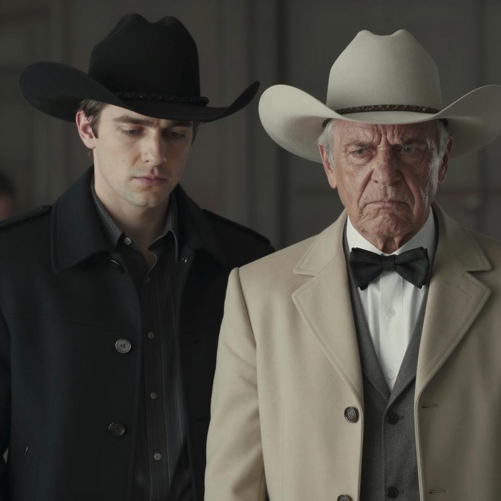 Photograph of two men in front of a white house with a red-trimmed roof. Man on left has brown hair, light skin, and neutral expression. Man on right has gray hair, light skin, white hat with red stripe, and slightly furrowed brow. Blue sky background. Both men are upper body only, wearing formal clothing.