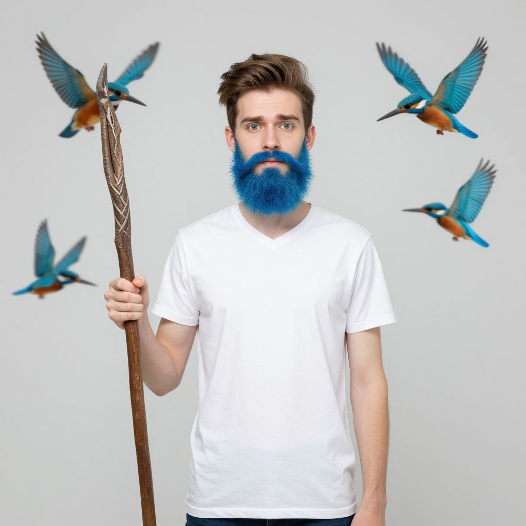 Brand Identity A skinny young man with a blue beard, a blue moustache, holding a forked staff with kingfishers flying around.,