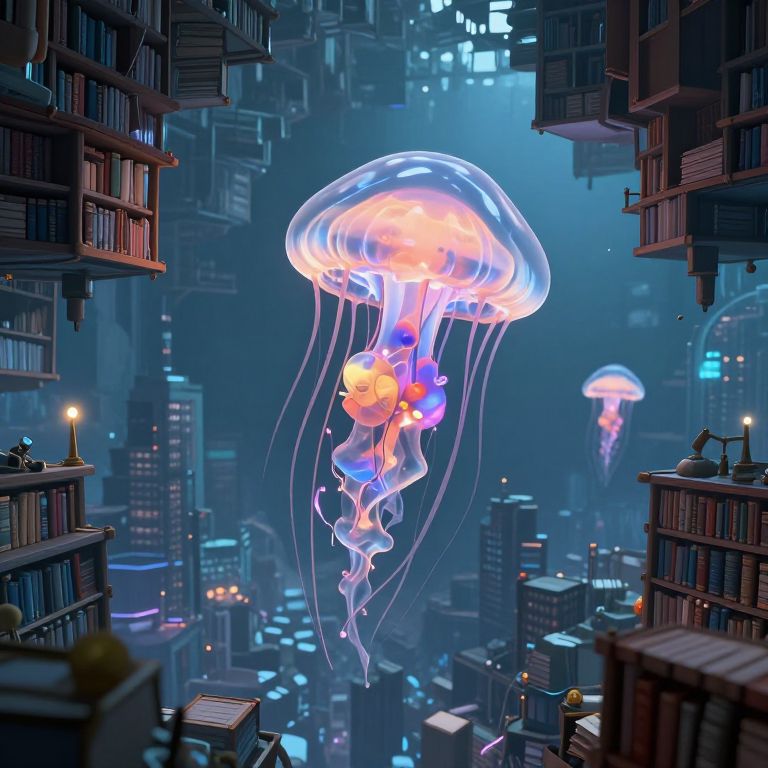 Great mechanical jellyfish drift through inverted cities, their gelatinous bodies buoying gravity-defying libraries filled with liquid pages.