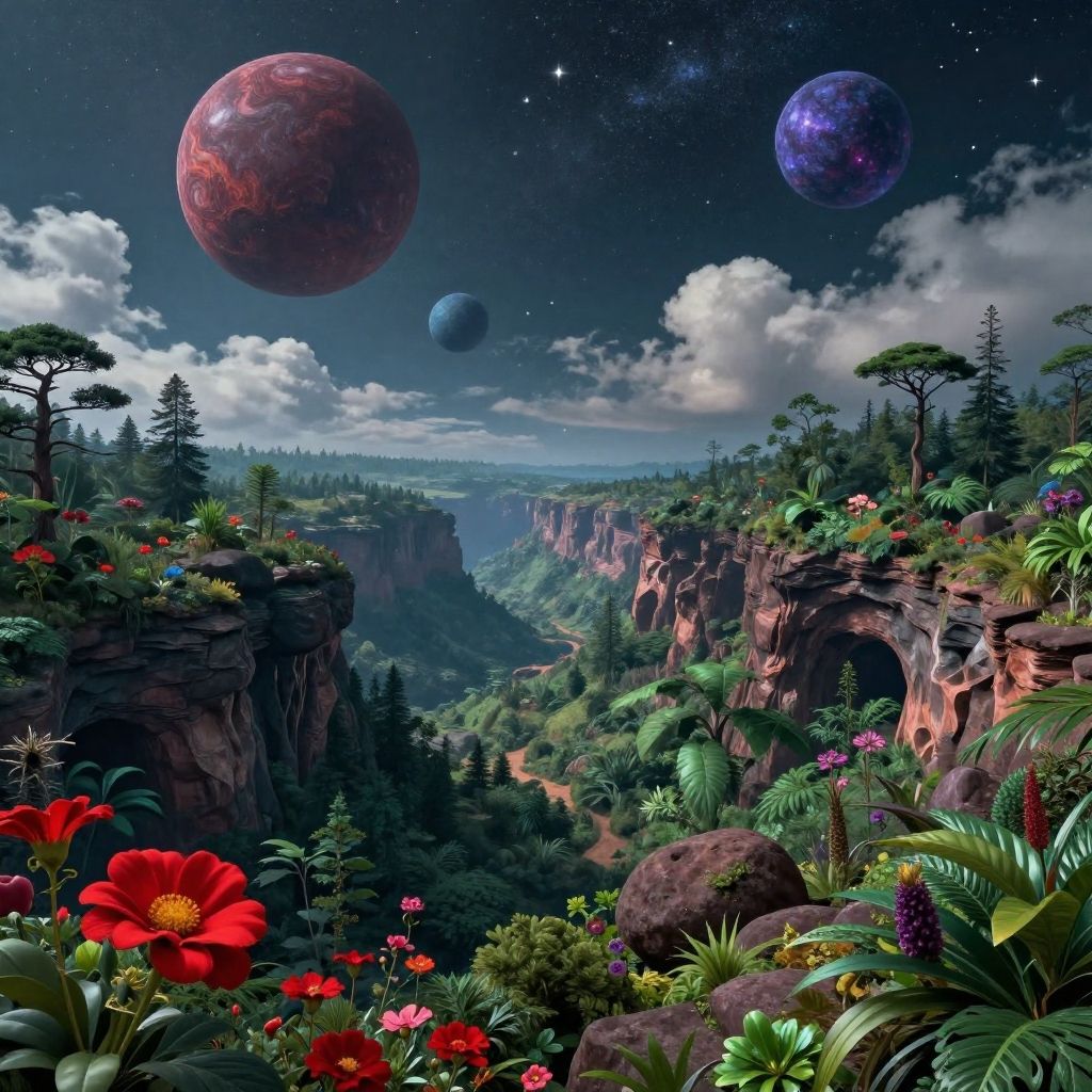Digital art of a vibrant, fantasy landscape with towering cliffs, colorful flowers, lush greenery, and three large planets in a starry night sky.