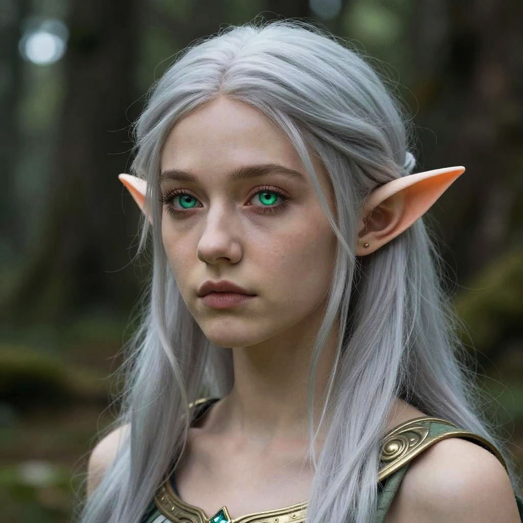 Elf portrait, detailed fantasy character with pointed ears and emerald green eyes, long flowing silver hair, intricate woodland background, soft natural lighting, mystical atmosphere