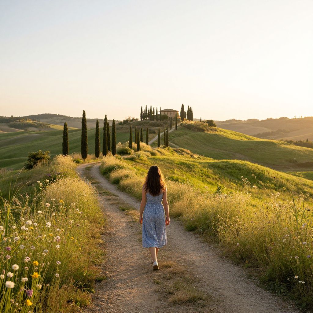 Woman walking along a sunlit path in Tuscany, Italy, surrounded by wildflowers and cypress trees, with rolling hills and a distant villa bathed in golden sunlight.