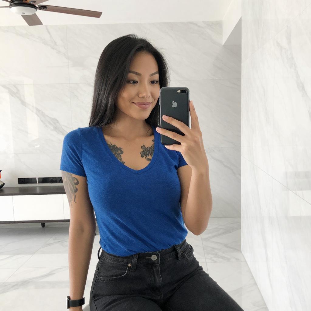 Photograph of an Asian woman with long black hair, wearing a blue V-neck t-shirt and black jeans, taking a mirror selfie. She has tattoos on her chest and arm, and is seated in a modern room with white marble walls and a ceiling fan. She smiles slightly, holding a black smartphone in her right hand.