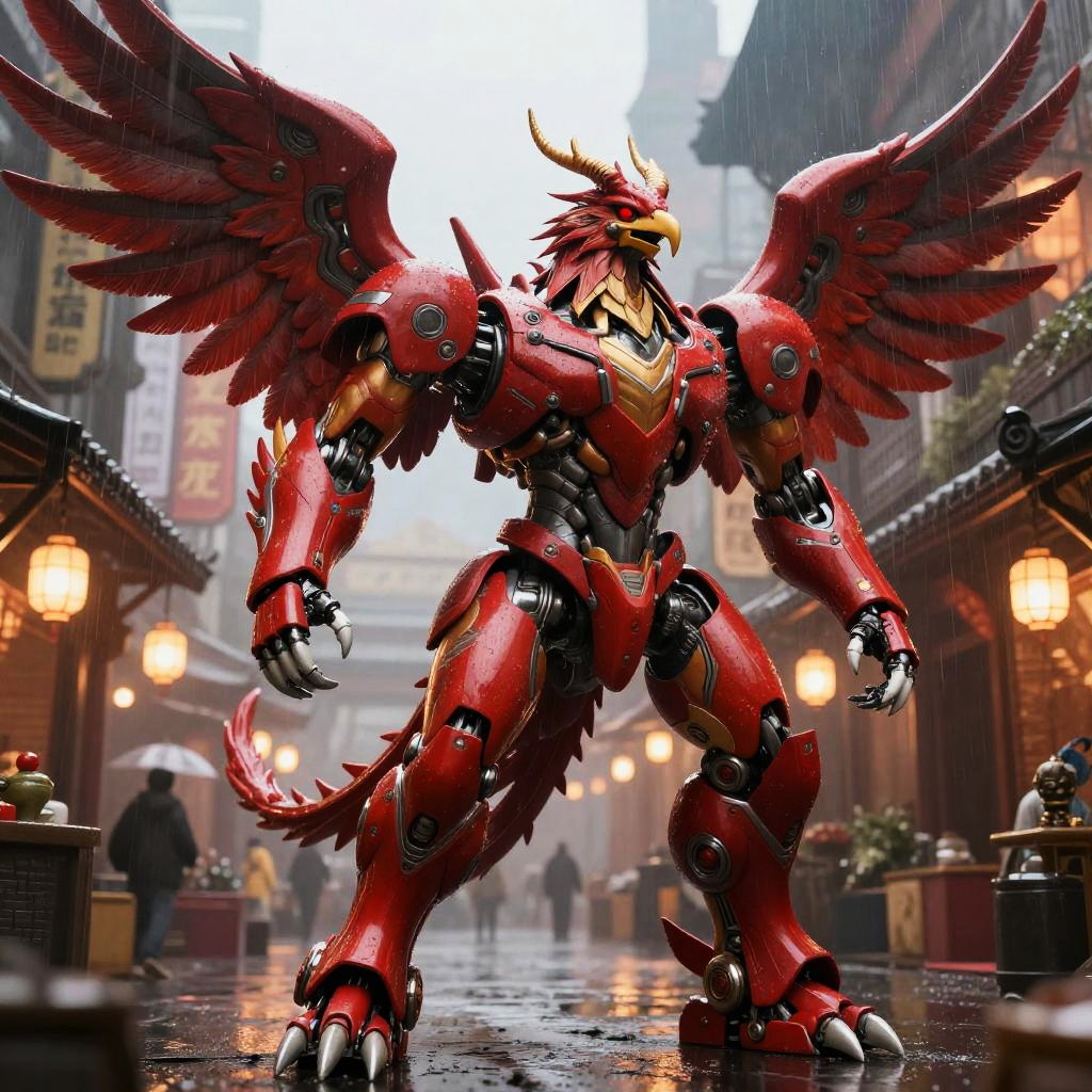 Crimson Phoenix Mecha in Rainy Sci-Fi Plaza