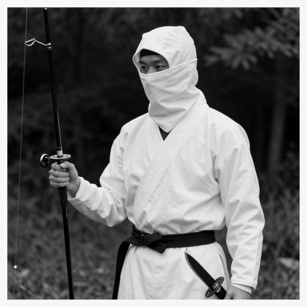 Black-and-white photograph of a person in full ninja gear, including a hood and mask, holding a fishing rod in their right hand and a knife in their left. They are standing outdoors with dense foliage in the background. The ninja's outfit is white, contrasting with the dark surroundings. The image has a bold, graphic border with at the bottom.