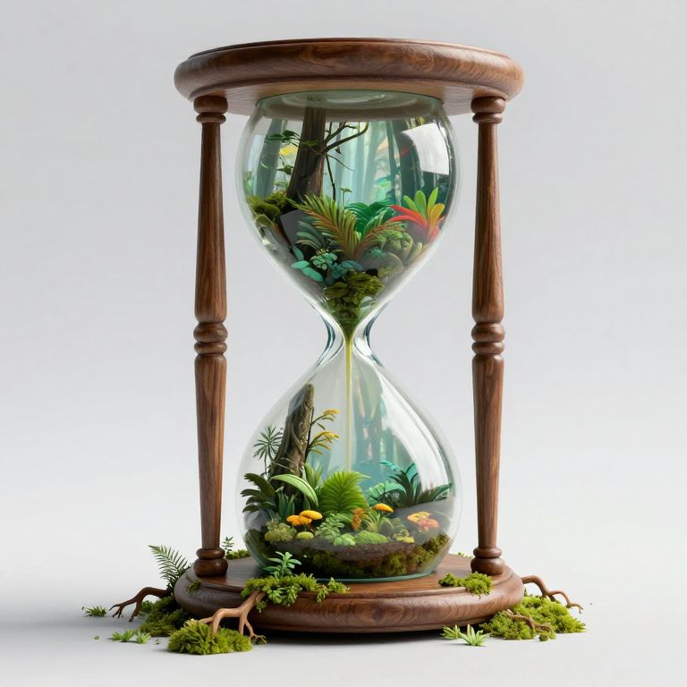 A surreal 3D-rendered scene depicts a colossal hourglass cradled by mossy roots, its glass encasing a vibrant rainforest that pulsates with life, symbolizing the rhythmic cycle of time and nature in a high-definition, ethereal visual effect.