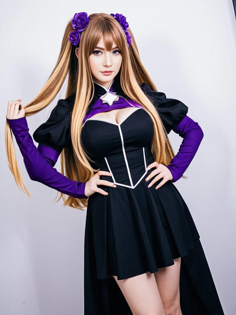 Photo-realistic cosplay photo of person in anya melfissa costume. 1girl, purple eyes, brown hair, blonde hair, streaked hair, gradient hair, very long hair, long hair, two side up, hair ornament, medium breasts, black dress, detached sleeves, virtual youtuber, virtual youtuber. full body shot