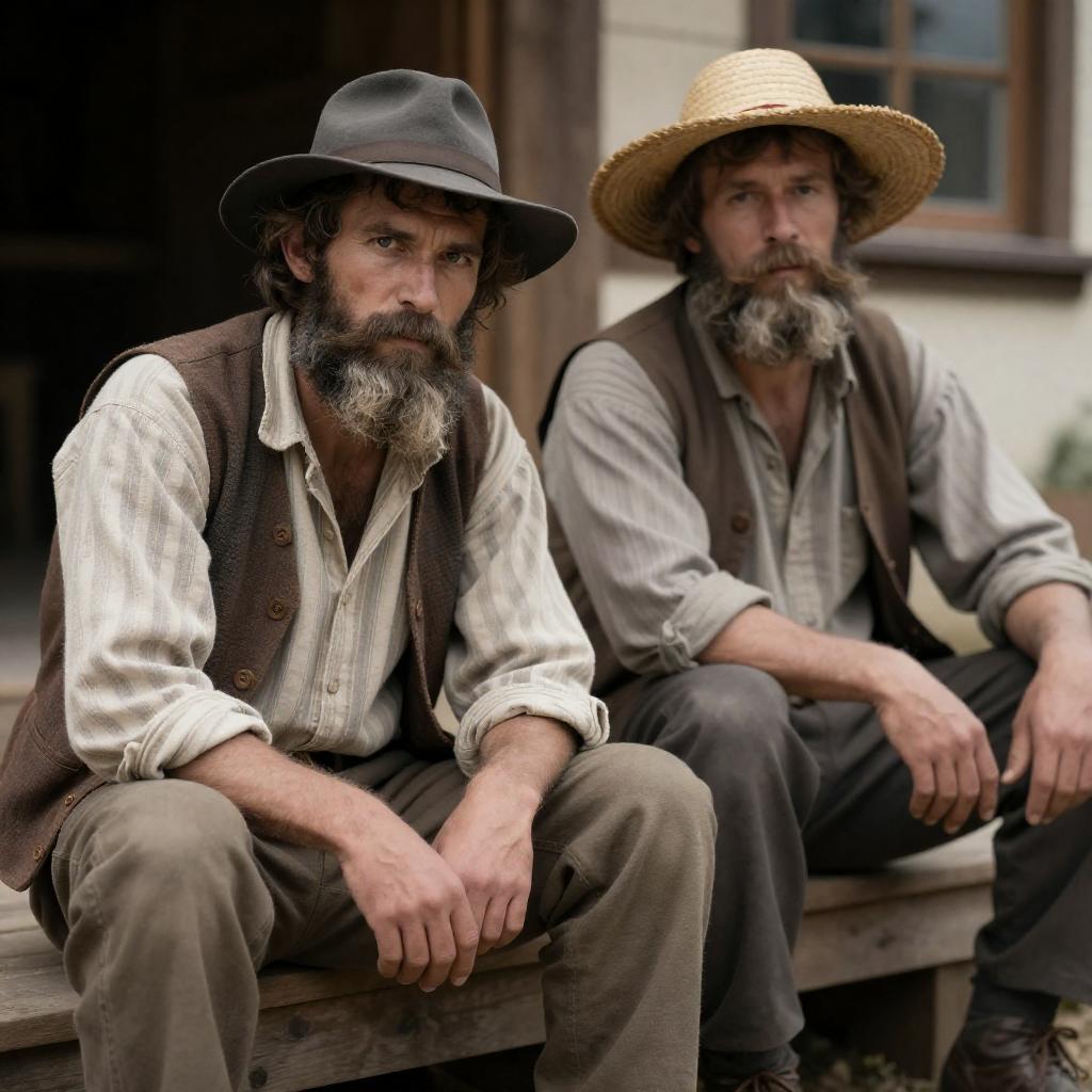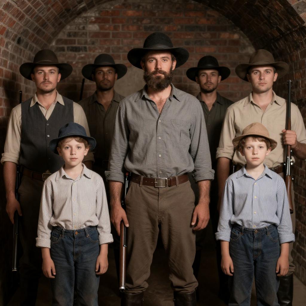 Photograph of a diverse group of men and children in 19th-century Western attire, standing in a dimly lit brick tunnel. Central figure, a bearded man with medium brown skin and a gray shirt, wears a black hat and carries a gun. Surrounding him are men in similar hats and clothing, some with rifles. Children are dressed in striped shirts and hats. The background features a ured brick wall.