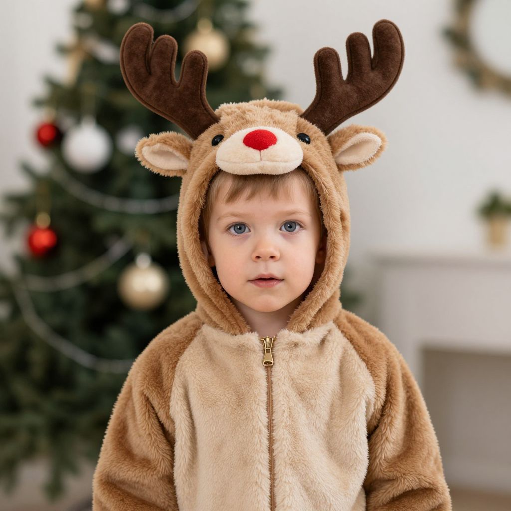 Photograph of a young Caucasian boy with light skin and blue eyes, wearing a fluffy, brown reindeer-themed onesie with dark brown antlers, a red nose, and a beige chest. He has short, light brown hair and a neutral expression. In the blurred background, there's a decorated Christmas tree with red and gold ornaments and a white fireplace with a garland. The image has a bright, festive atmosphere, emphasizing holiday cheer.